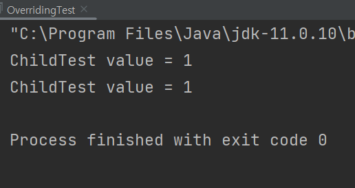 ChildTest는 자식 클래스, ParentTest는 부모 클래스에 해당한다. main을 확인해보면, parentTest의 객체 인스턴스 변수에 ChildTest() 클래스 객체를 할당했다. 오버라이딩이 컴파일 시점에서 이루어졌다면 ParentTest value = 1이 출력될 것이고, 런타임 시점에서 이루어졌다면 ChildTest value = 1이 출력될 것이다. 출력 결과는 다음과 같다.